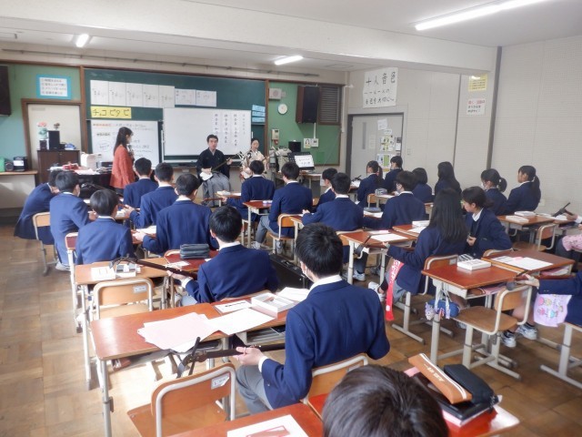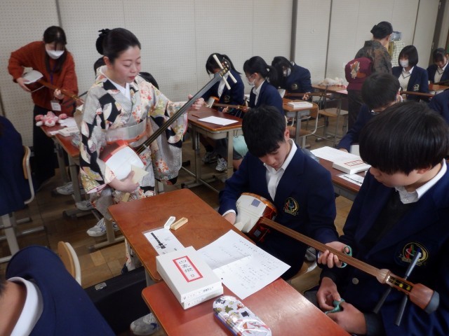 さて、そんな節分の日に、2年生の音楽の授業では、講師の方3名をお招きして、三味線の授業を行いました。事前に三味線の扱い方や弾き方などを学習してから本日を迎えました。