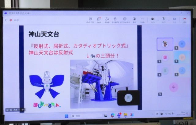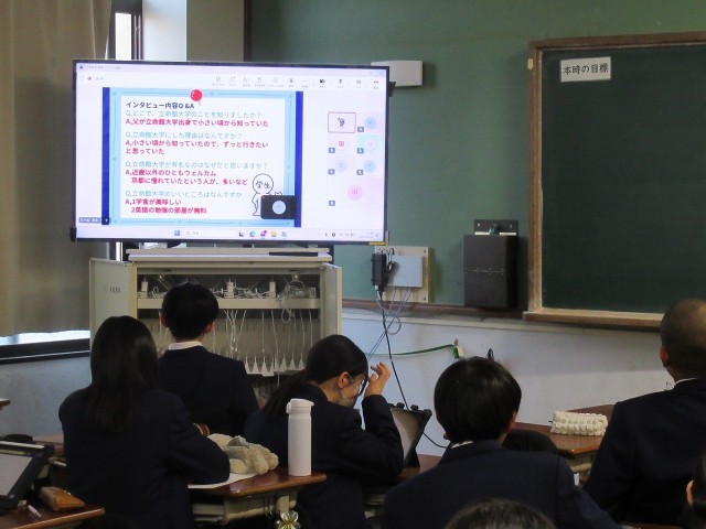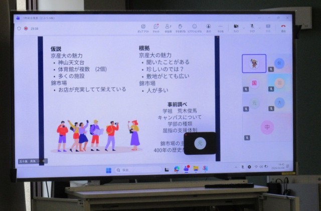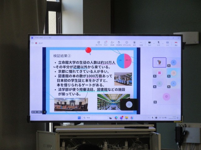 1年生の総合的な学習の時間では、「京都の魅力、再発見!」の各クラスの代表が集まり、Teamsを使ってオンライン発表を行いました。司会の進行のもと、代表者あいさつが行われ、発表の趣旨説明がありました。発表者は、自分のGIGA端末をうまく使って、カメラに向けてプレゼンテーションを行います。写真は、立命館大学と京都産業大学について、発表しているスライドです。それぞれの班が、それぞれの大学の魅力について探ってきました。なぜ魅力があるのか、仮説を立て、その検証を行うためのデータを、それぞれの大学でインタビューなどを通して行ったそうです。改めて思うのは、今の大学って、本当に設備が整っているなぁ、と感じます。「なぜそこで学ぶのか」「どのように学べるのか」「最終的に、何ができるようになるのか」。京都の魅力の一つとして、まさに「大学のまち京都」を実感した発表でした!