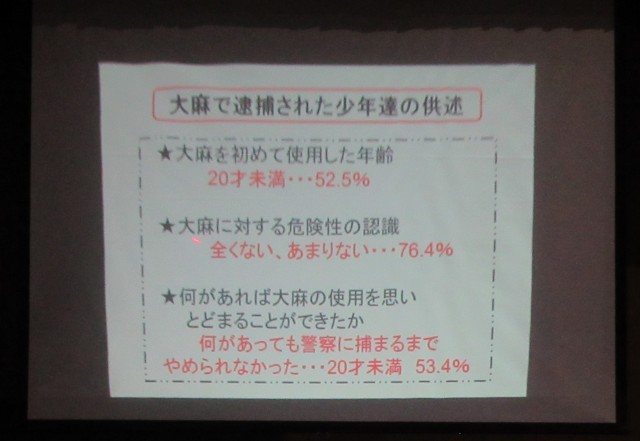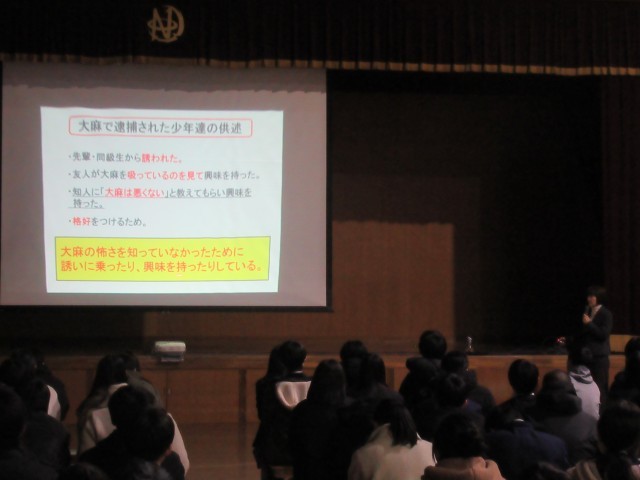 今日の6限目、3年生は体育館に集まって、薬物乱用防止教室を行いました。講師は、北警察署のスクールサポーターの方です。私はお話を聞いていて、一番印象に残ったのは、大麻で逮捕された少年たちの供述の中で、大麻を初めて使用した年齢が「20歳未満が52.5%」ということ、大麻に対する危険性の認識が「全くない、あまりないが76.4%」ということ、「何があっても警察に捕まるまでやめられなかった、ということが53.4%」であったということです。いくら大麻は危険と啓発しても、「自分は大丈夫」「これくらいなら」という心がある限り、人はおよそ変わることができないのだろうか…そんな気持ちになりました。大切なのは、やはり「自分で自分を大切にすること」。薬物乱用が自分をむしばむことに気付き、自分で自分をコントロールすることが一番です。もし、自分のためにコントロールができないのなら、自分のことを大切に思ってくれる人の顔を思い浮かべましょう。その人を困らせてしまうようなことを絶対にしない。お話を聞いていて、真剣にそう思いました。