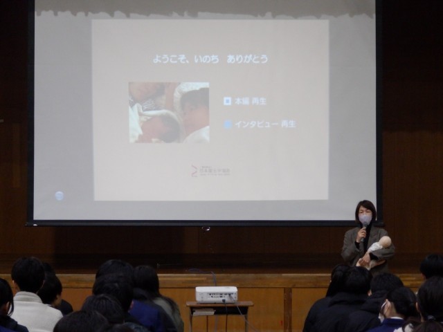 まず、見えないくらい小さな卵子から生まれるまでの成長の様子や胎児の心音を聞きました。まわりの人から大切にされ生まれてくる赤ちゃんの様子から、自分もこのようにまわりの方に愛されて生まれてきたことを感じたのではないでしょうか。