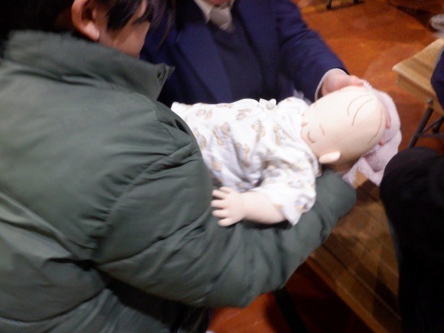 出産の進み方のお話や映像の後、持って来てくださった3kgの赤ちゃん人形を抱く体験を全員が行いました。「意外と重い」や「はじめて赤ちゃん(人形)抱いた」「私は小っちゃかったんやって」などの声が上がっていました。休憩時間にも、「もっと抱っこしたい」と繰り返し抱くほほえましい姿がたくさんみられました。