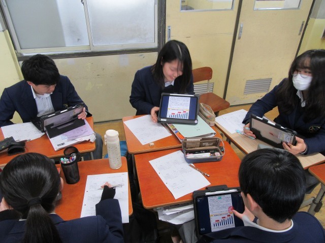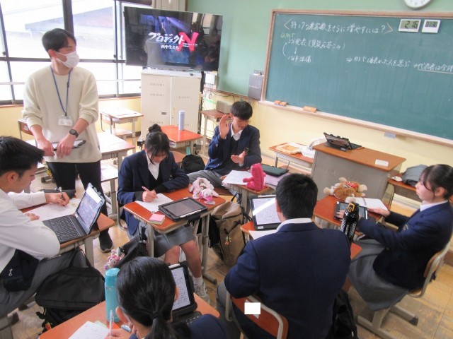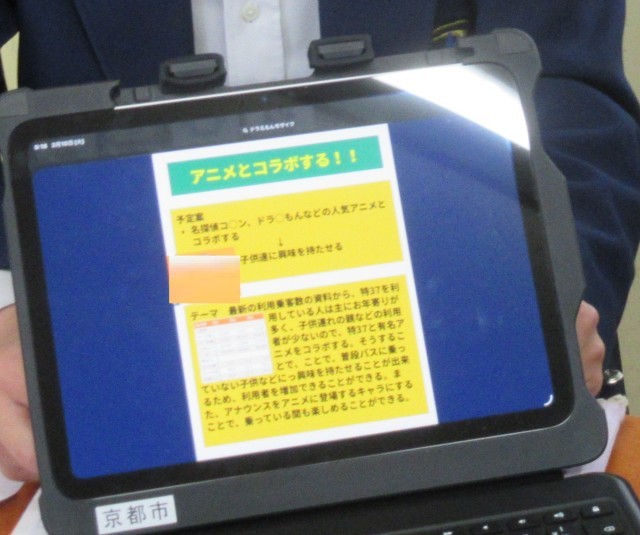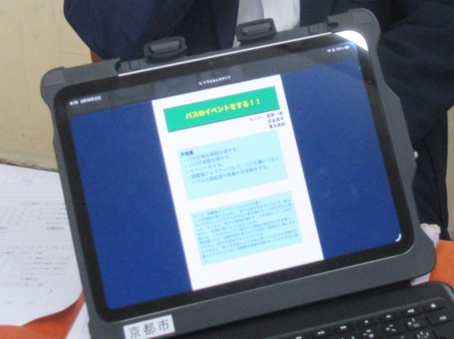 現在、2年生の社会科では、柊野自治連合会から御依頼のあった、特37系統沿線だよりの作成を行っています。地域を走る市バス特37系統を起点に、西賀茂地域の在り方を考える取組です。今日は、自分たちの考えた記事を互いに紹介し、各班のベストを全体発表します。グループでの発表を見せてもらう中で、今の特37系統のもつ魅力をどう伝えるか、さらに活用するためにはどう変わっていけばよいのか、自分たちの調べたことを根拠に考えを紹介してくれていました。発表の様子をしっかり相互評価しながら、地域の在り方について考えてくれている様子に、きっと良い沿線だよりができるな、と確信しています!