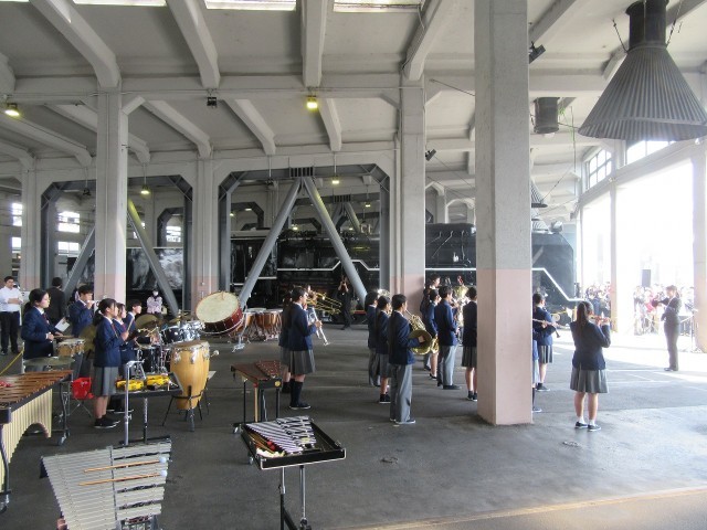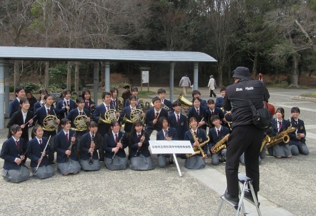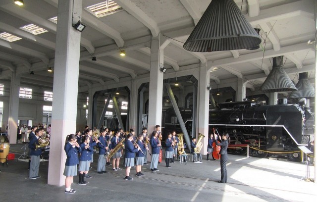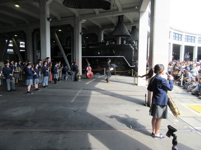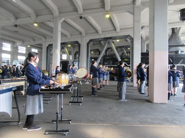 3月20日(祝・金)、昨日までの雨がすっかりあがって、絶好のコンサート日和。吹奏楽部の皆さんは、JR梅小路西駅の隣にある梅小路公園で、京都市主催の「さくらパレード」に出演してきました。桜の花には少し早いですが、暖かな日差しが降り注ぎ、多くの方が集まっておられました。午前の部は公園の芝生広場で行われ、午後は何と鉄道博物館の中にある、蒸気機関車の機関庫で行われました。いつもと違う場所での演奏ですが、さすが吹奏楽部。3年生を送る会、卒業式と本番を重ねている成果が出ていましたね!卒業生の先輩たちも「良い演奏でした!」とほめてくれていました。機関庫での演奏の時、マツケンサンバの演奏終わりに、蒸気機関車の運転士さんが「プォオーーッ!!」と機関車の汽笛を鳴らしてくれたオマケつき。楽しい一日をありがとうございました!なお、楽器運びでご協力いただいた保護者の皆様、本当にありがとうございました!