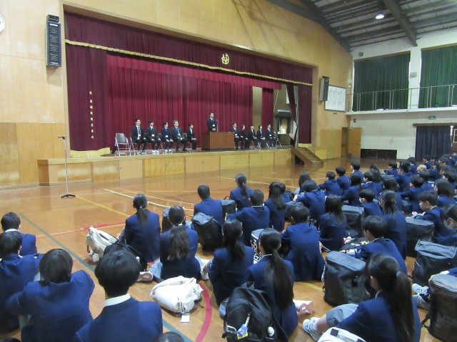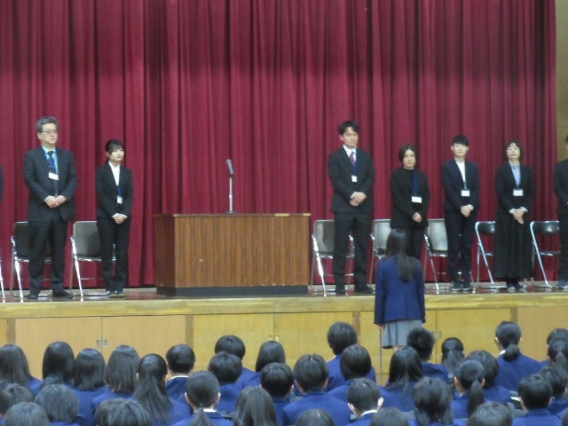 体育館に入り、ブレザーを着用して式典に臨む姿は、昨年度末から少し大人びていましたね。着任式では、今日、新たに14名の先生方が着任されました。着任者代表として、下川教頭先生からご挨拶があり、皆さんの返してくれた挨拶と、きちんと顔を上げて話を聞いてくれる様子に、「とても安心しています」とおっしゃっていました。そして、歓迎のあいさつでは、生活委員長のOさんから、新たな先生方をお迎えした喜びと、これから一緒に取り組んでいく決意が伝えられました。きっと、着任された先生方も、心新たに西中での生活に臨んでくださることでしょう。