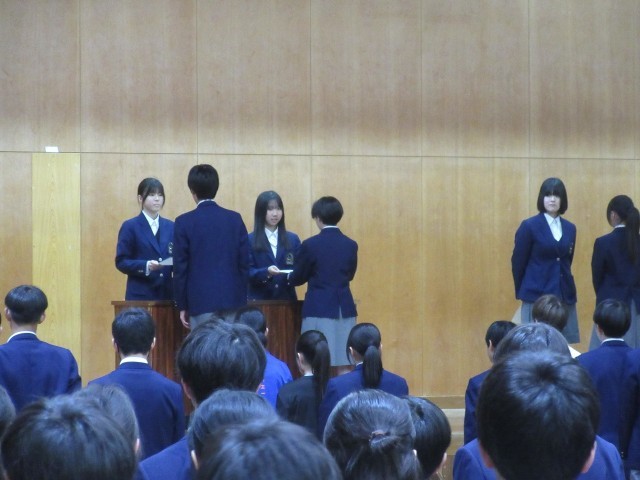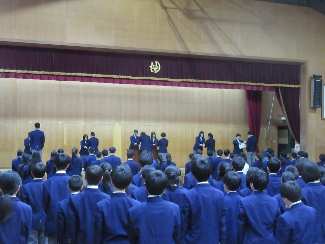昨日の5限、体育館で令和8年度前期学級役員の認証式が行われました。式典として校歌を斉唱したのち、クラスの先頭にいる学級役員さんたちが起立して、認証を受けました。本部役員の皆さんから手渡される認証書は、学級役員として認められるとともに、クラス・学校の代表としてみんなために活動する責務を負います。だからこそ、やりがいがあるとともに、取りまとめたり、協力を求めたりするうえで、苦労もあるでしょう。クラスの皆さん、選んだ学級役員の皆さんが活躍できるよう、協力よろしくお願いします!