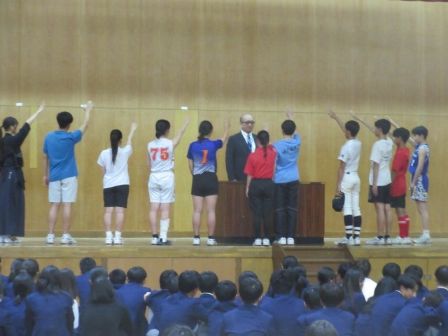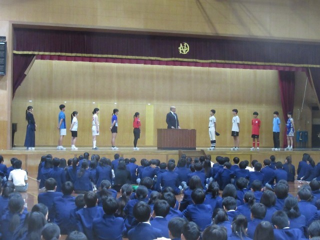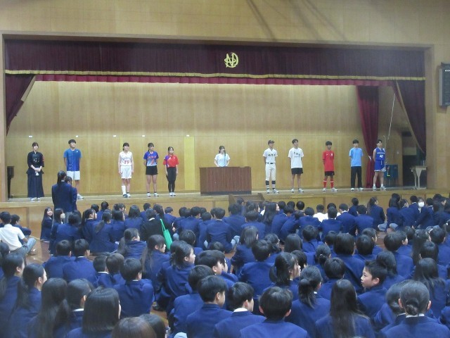 認証式に続いて、春季総合体育大会に出場する部活動への壮行会が開かれました。各部を代表して、キャプテンがユニフォームや道着姿で入場し、吹奏楽部の演奏と拍手に包まれながら堂々と行進してくれました。壇上では、それぞれが試合に臨む抱負を発表したのち、選手宣誓をしてくれました。その姿からは、真摯にスポーツを楽しみ、チームで成果を創り上げていこうという思いが、しっかりと伝わってきました。練習は試合のように、試合は練習のように、ぜひ日頃の積重ねを、発揮してきてくださいね。応援もよろしくお願いいたします。なお、応援に行く場合は、選手や顧問の先生が試合に集中できるよう、西賀茂中学校生としてふさわしい行動をよろしくお願いいたします!