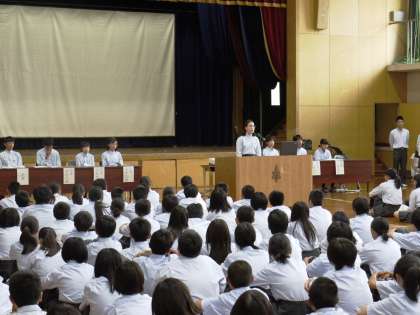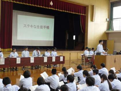 本日5・6限に,生徒総会が行われました。今年度の生徒会テーマは「栄光〜進め,旭に向かって〜」です。本部の基調提案に続いて,各委員会や各学年の方針が説明されました。