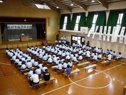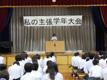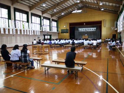 2年生は,3・4限に学年大会を行いました。各クラスから選ばれた代表者17名が,それぞれのテーマについて発表しました。落ち着いた雰囲気の中,生徒たちは適度な緊張感を持って発表できていました。家族や学校での人間関係について,命の大切さや差別の問題,政治や国際関係についてなど,昨年と比べると視野が広がり,内容も深まったものになっていたのではないかと思います。
