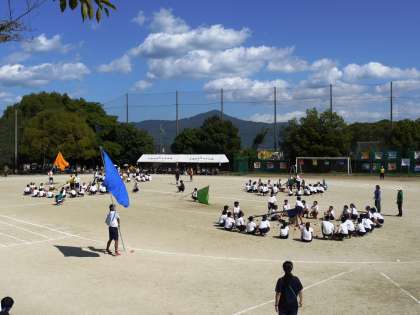午後1番目の競技「色別玉入れ」です。各色の全学年が協力して行います。