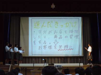 2年HT(ヒューマンタイム)の発表「広めよう,深めよう 職場体験学習」です。生き方探究・チャレンジ体験で調べたことや感じたことなどを,ポスターセッションで発表しました。