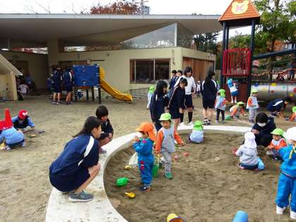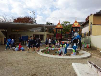 本日2限,3年生はクラスで家庭科の授業として幼稚園を訪問し,実習を行いました。最初は緊張していた生徒たちも,徐々に慣れてくると,園児たちと一緒に楽しそうに活動していました。