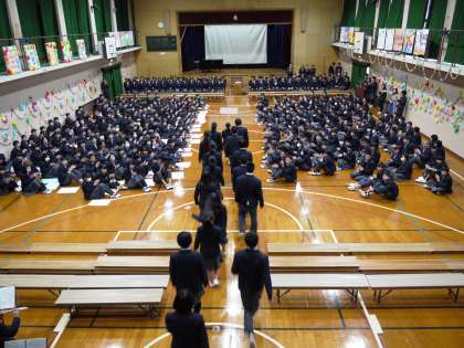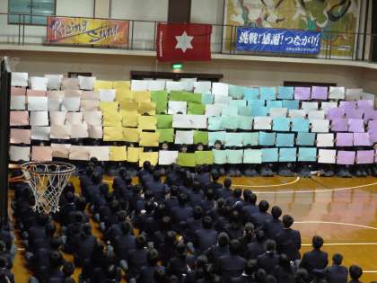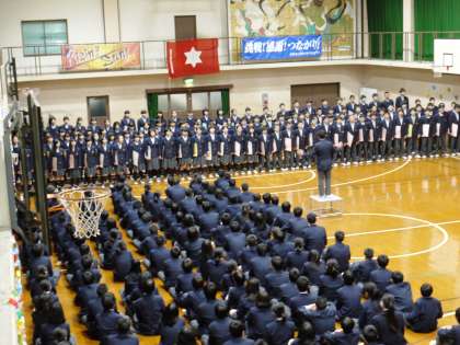 本日午後,「3年生を送る会」が開催されました。この日のために,各学年の生徒たちは,一生懸命練習に取り組みました。1年生は「ハピネス」に合わせて,人文字で3年生に送る言葉を表現しました。続いて「糸」を合唱し,感謝の気持ちを精一杯伝えました。