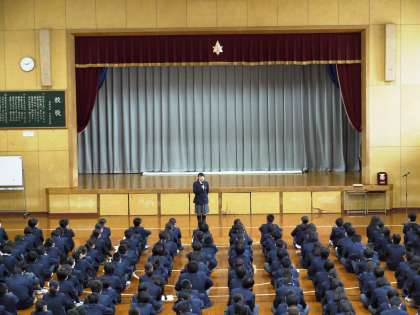 本日1限,平成29年度の修了式を行いました。表彰式の後,校長先生からはこの1年間を振り返り「4月からは上級生・最上級生としての自覚を持って頑張りましょう」というお話がありました。最後に生徒会長から,来年度の生徒会活動への協力のお願いと,「サンコン最初の一歩」の紹介がありました。1・2年生だけの修了式でしたが,しっかりと集中できていました。来年度は新入生のお手本になれるよう,頑張りましょう!