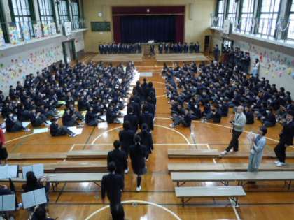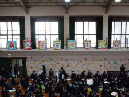 午後の2時間を使って,「新入生を迎える会」が行われました。緊張の面持ちの1年生。2・3年生の先輩たちは,かわいい後輩たちを思い切り楽しませようと,様々なイベントを企画してくれました。1年生の皆さんは吹奏楽部の演奏で入場。委員会の説明,部活動の紹介も行われました。