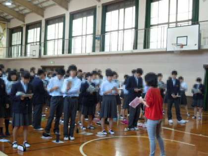 5月7日(月)から2泊3日で行われる3年生の宿泊学習。5月6日(日)は前日登校がありました。宿泊学習関係では,集団行動や平和セレモニーのリハーサル・結団式などを体育館で行いました。心に残る素敵な宿泊学習になりますように。
