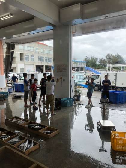 あるグループが農山漁村生活体験で,民家の方に連れられて読谷村漁業組合に来ていました。新鮮な魚介類がたくさん!