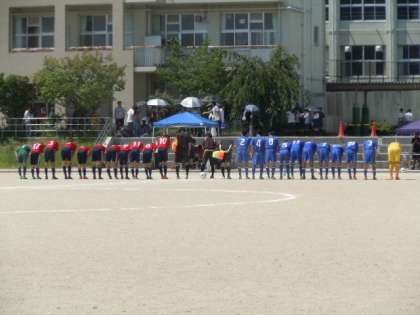 2回戦が7月15日(日)に大枝中学校で行われました。京都産業大学附属中学校と対戦し,0−0で試合終了。その後のPK戦を制しての勝利となりました。粘りに粘っての勝利,次の試合も頑張ってください。
