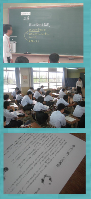 3年生では,読み物資料:「路上に散った正義感」(中学生の道徳2 自分を考える あかつき)を教材として, 社会正義 について考えました。自己中心的な考え方から脱却して,公のこととのかかわりや社会の中における自分の立場に目を向け,社会をよりよくしていこう。「見て見ぬふりをする」とか,「避けて通る」という消極的な立場ではなく,不正を憎み,不正な言動を断固として否定する態度とはどのような態度なのか等について考えました。