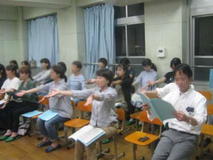 10月9日(火)19時より北校舎4階音楽室で4回目となるPTAコーラスの練習が行われました。来る11月3日(土)に行われる『かがやく丘コンサート』で毎年恒例となっているPTAコーラスの合唱練習です。身振り手振りをつけての練習も行っています。どんどん上手になっています!!
