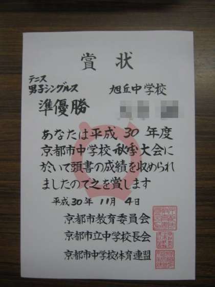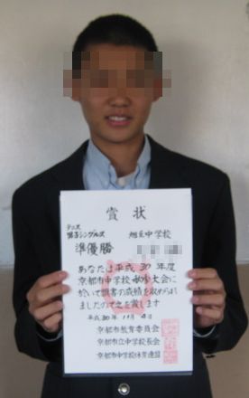 11月4日(日)に同志社中学校で男子シングルスの決勝戦が行われました。1セットマッチでの試合。対戦相手は強敵でした。結果,準優勝となりました。春季大会の優勝めざして,今後も練習に励んでください。おめでとうございます。