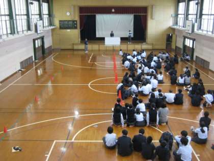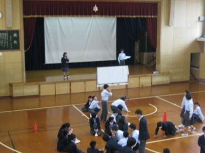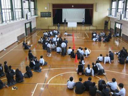 11月7日(水)の昼休みの時間を利用して,1年生全員が体育館で『○×ゲーム』を行いました。学年の親睦を深めようということで,生徒が提案し進行も行ってくれました。問題も考えてくれました。ワイワイ楽しい時間となりました。