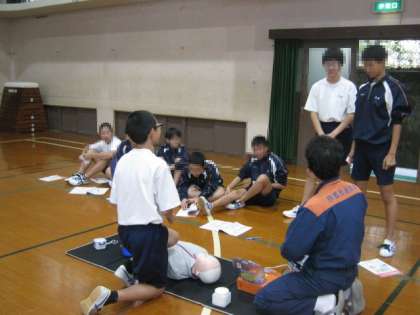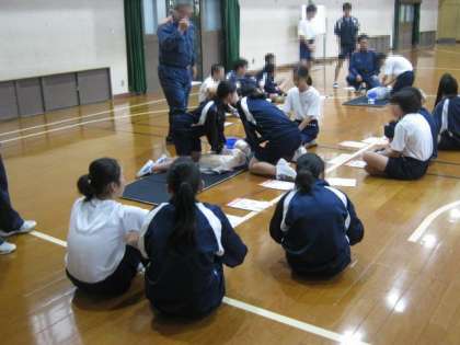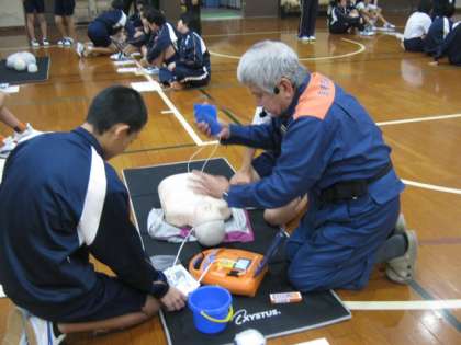 11月9日(金)午前中の時間,体育館において,北消防署の方を講師に,2年生対象の心肺蘇生法実技講習が行われました。本日は1時間ずつ各クラスごとに4つのグループに分かれて,人形を使って人工呼吸の仕方やAEDの使い方を学びました。