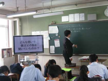 1年生では,ローテーション道徳。ある先生は,読み物資料:「父の大文字」を教材として, 郷土の伝統と文化の尊重,郷土を愛する態度 について考えました。五山の送り火を題材に大文字が見えない廃校になった屋上へ子どもを誘う父の思いについて考えました。屋上から見えるであろう大文字に思いを寄せる父の姿を通して,郷土に対する認識を深め,地域の一員として郷土を愛し,発展につとめようとすることの大切さを学びました。