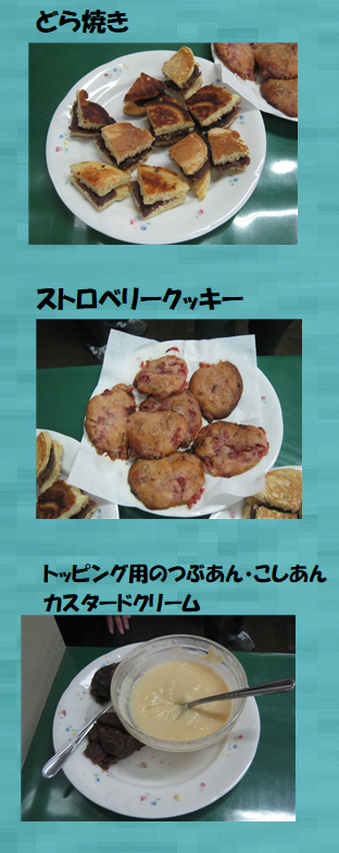 12月17日(月)1組(育成学級)が調理室で調理実習を行いました。どら焼きとストロベリークッキーを作りました。また,トッピングにつぶあんとこしあんとカスタードクリームも。とてもおいしく出来たようです。『どうぞお食べください』ということで,いただいた教職員の評判も上々でした。