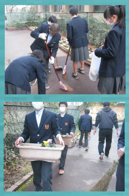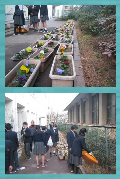 2月5日(火)の放課後,管理用務員さんや1・2年生の美化委員のみなさんがパンジー苗をプランターに植え替えてくれました。丁寧に世話をして,このプランターのパンジーで卒業式の花道を飾ります。