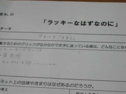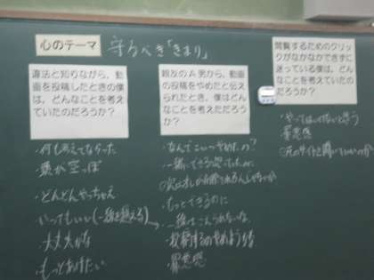 1年生では,読み物資料:「ラッキーなはずなのに」を教材として,遵法精神・公徳心 について考えました。違法と知りながら,録画したアニメを動画共有サイトに投稿している僕が,同じことをしていた親友からもう投稿をやめると告げられる。そのような話から,法や決まりの意義を理解し,よりよい社会の実現に向けて,自分に課せられた義務を確実に果たすことが大切であることを学びました。