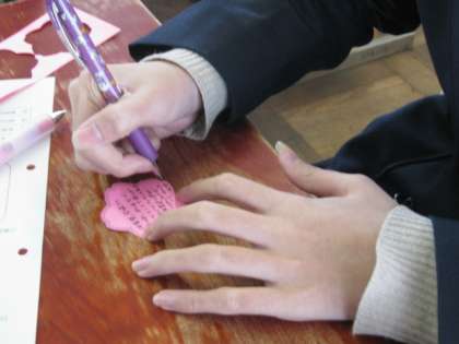 1年生では,3年生の卒業が間近に迫ったこの時期,心のテーマを『贈る言葉に込める思い』として,思いやり・感謝 について考えました。なりたい先輩の理想像を描くことで,今の自分に足りないものを明確にし,次の上級学年へ向けての見通しや目標を考えました。その中で,理想像を現在の3年生の姿と重ね合わせることで,尊敬の念と共に感謝の気持ちや,思いを引き継ぐことの大切さを学びました。終わりには,卒業する3年生にメッセージを書きました。