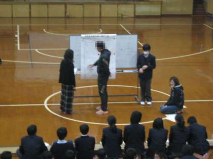 3月1日(金)の5・6限,1年生はHTの時間に3年生を送る会の取組を行いました。体育館,教室,グランドと場所変えながら一生懸命に取り組みました。