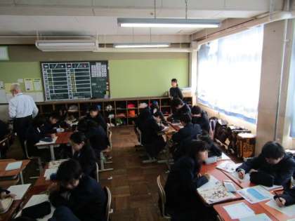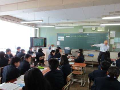 2年生では,視聴覚教材:「うたエール」(ゆず)を教材として, 希望と勇気,克己と強い意志 について考えました。「応援される人ってどんな人ですか?」の問いかけから,「うたエール」を聴き,歌詞の意味も考えながら「この1年で自分が頑張りきりたいこと,そしてそのために何ができるか」を班で意見交流し,クラス全体でも意見交流しました。困難や失敗があろうとも努力し続けることの大切さを学びました。