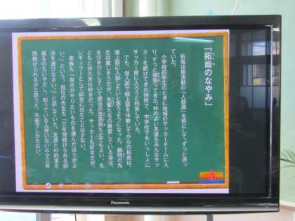 3年生では,読み物資料:「早朝ドリブル」(教科書 新しい道徳3)を教材として,節度・節制 について考えました。「今年,頑張りたいことはどんなことですか?」の問いかけから教材を読み,「あわてず,あせらず,生活のリズムをしっかり作って,1日1日を着実につないでいこうとはどういうことか」を考えました。そして,生活リズムの乱れに葛藤する主人公の姿を通して,進んで節度と調和のある生活をすることの大切さを学びました。