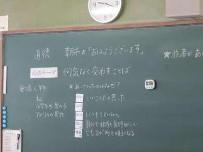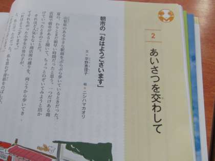 1年生では,読み物資料:「『あいさつをかわして』朝市の「おはようございます」