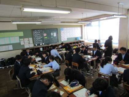 3年生では,視聴覚資料:「島唄」(THE BOOM)を教材として,国際理解 について考えました。THE BOOM の「島唄」は沖縄民謡や琉球音階を取り入れた楽曲で,国内で150万枚の大ヒットをしました。また,アルゼンチンのマルチタタレントのアルフレッド・カセーロさんは,この曲を偶然耳にし,原曲(日本語)のままアルゼンチンでカバーし,不況の中,異例の大ヒットとなりました。その「島唄」に込められた平和への願いを理解し,国や言語を超えて通じ合おうと思う心や,信頼関係を結ぼうとする心を育みました。