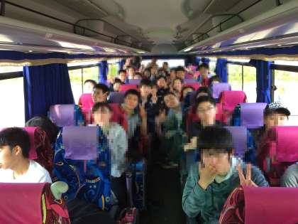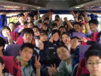 一行は読谷村に到着。入村式・ホームステイオリエンテーションがこれから始まります。元気な笑顔が一杯です!