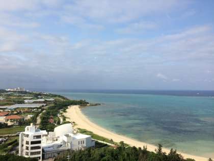 ホテルからの眺めです。真っ青の海が広がっています。太陽の光の当たり方によって、海の色が変化しています!