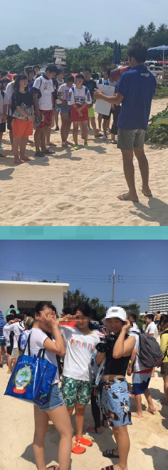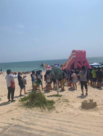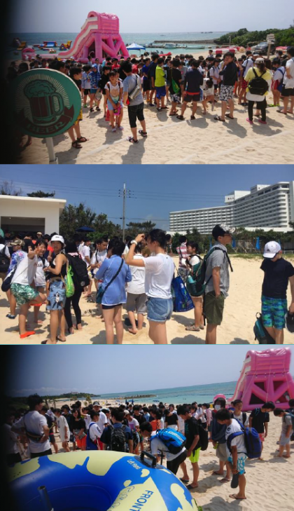 ホテルに荷物を置いた生徒のみなさんがビーチに集まってきました。インストラクターの方の説明を聞き,いよいよマリン体験がスタートします。天気はOKです!