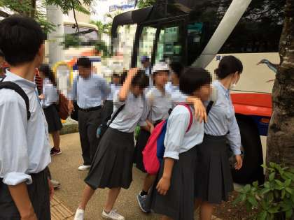 予定通りの時刻にバスはホテルを出発。国際通りでのグループ別研修も始まっています。お土産選びは大変かな!!