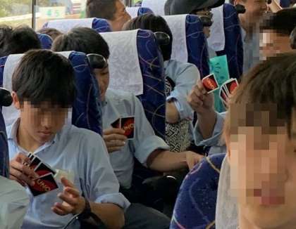 バスの中でもトランプで遊んでいます。元気です。南インター通過時に帰着する時間をお知らせします。よろしくお願いします!
