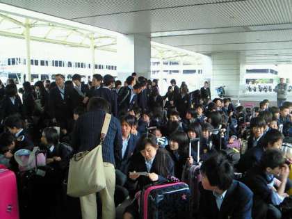 「目立った渋滞もなく,ほぼ予定通りに伊丹空港に到着しました。朝の結団式では眠そうでしたが,これから飛行機に乗るとなればみんなも元気が出てきたようです。予定通り9:15発JAL2081便に搭乗します。行ってきます!」