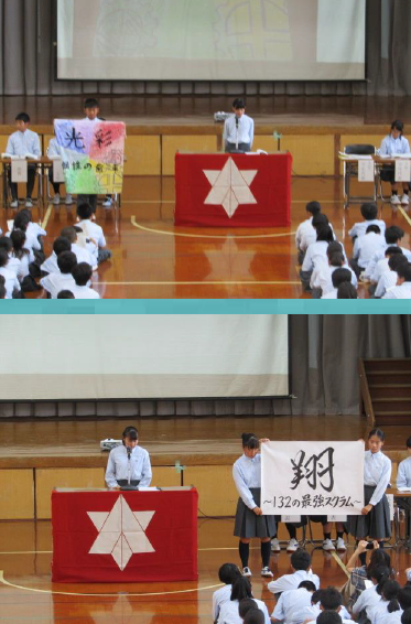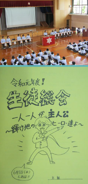 6月5日(水)5・6限に,生徒総会が行われました。今年度の生徒会テーマは「一人一人が主人公〜輝け旭のヒーロー達よ〜」です。本部の基調提案に続いて,各委員会や各学年の方針が説明されました。また,各クラスの学級旗の紹介も行われました。発表する生徒のみなさんも発表を聞く生徒のみなさんも立派な態度でした。