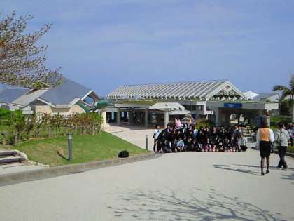 3日目にもなると少し疲れを見せる人もいますが,まだまだ元気なようです。入り口のジンベイザメの前で記念撮影をした後,本物のジンベイザメを見に行きます。