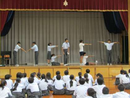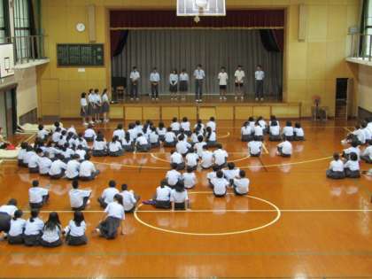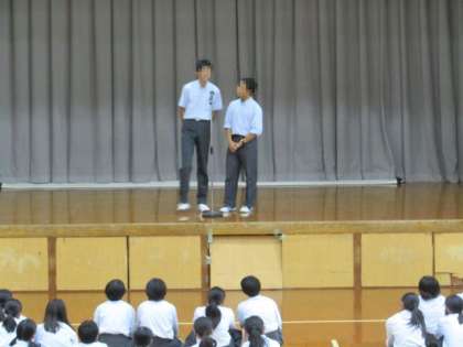 7月9日(火)お昼休み時間を使い,体育館で生徒会の新しい取組の『MEET』の説明を生徒会本部役員の生徒のみなさんが行いました。みんなで(M)笑顔で(E)エンジョイ(E)タイム(T)の略称が『MEET』です。生徒会テーマにある【一人一人が主人公】となれるよう学年のわくを超えたレクレーションを行う取組がこの『MEET』です。乞うご期待下さい!!