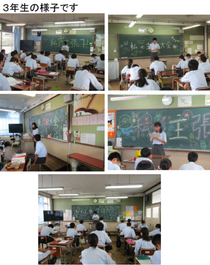 8月29日(木)5・6限,各クラスで「私の主張〜学級大会〜」が行われました。勉強や部活動のこと,家族のことなど,生徒のみなさんは一生懸命発表していました。自分の考えをみんなの前で発表したり,いろいろな人の発表をしっかり聞いたりすることは,お互いのことを知り,お互いに認め合っていくうえでとても大切なことです。このあと,9月11日(水)には「私の主張〜全校大会〜」が行われます。学級の代表として選ばれた人は,全校生徒の前で是非とも頑張って発表して欲しいと思います。
