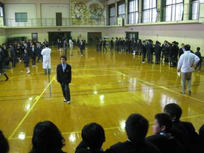 その後1年生全員が体育館に移動し、全員で、「3人組」や「男子3人・女子3人」や「同じ血液型」など、様々な条件で小グループを作りました。