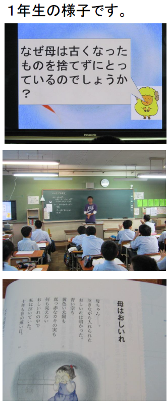 1年生では,教科書:「母はおしいれ」(新しい道徳1)を教材として,家族愛,家族生活の充実 について考えました。色々なものを詰め込んだおしいれを整理していた母が「お母ちゃんもおしいれだよ」とつぶやいた。家族に心配をかけないように母が自分の心の中に面倒なことをしまいこんできたことに私は気付く。子を思う母,母を思う子,それぞれの愛情に共感し,家族が互いに信頼し合い,感謝し合う温かい家族を築いていこうとする心情を育みました。