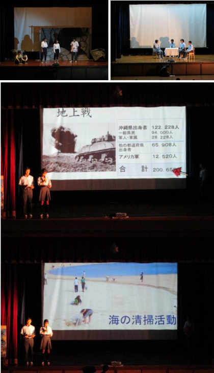 2年生の後半から事前学習を始め,実際に沖縄に行き,そこでの学びをさらに探究し,まとめてきました。その学びの成果を沖縄文化の紹介や群読,劇やプレゼンテーションを通して伝えます。