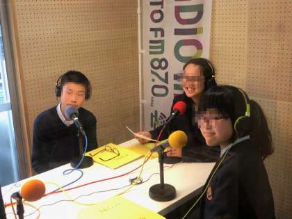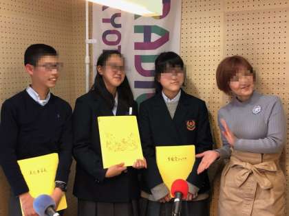 2月3日(月)の放課後,本校の本部役員3名(2年生2名,1年生1名)の生徒が地域のFM局の番組に出演し,旭丘中学校のことを紹介しました。今日は事前の収録でした。その模様は3月5日(木)に放送される予定になっています。本部役員のみなさん,ありがとうございました。